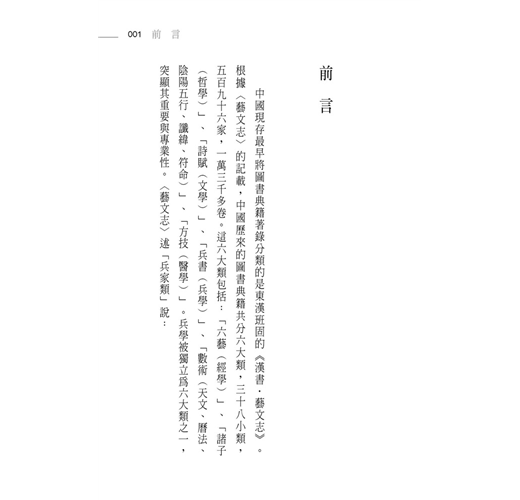 中國現存最早將圖書典籍著錄分類的是東漢班固的《漢書‧藝文志》。根據〈藝文志〉的記載,中國歷來的圖書典籍共分六大類,三十八小類,五百九十六家,一萬三千多卷。這六大類包括:「六藝(經學)」、「諸子(哲學)」、「詩賦(文學)」、「兵書(兵學)」、「數術(天文、曆法、陰陽五行、讖緯、符命)」、「方技(醫學)」。兵學被獨立為六大類之一,突顯其重要與專業性。〈藝文志〉述「兵家類」說: