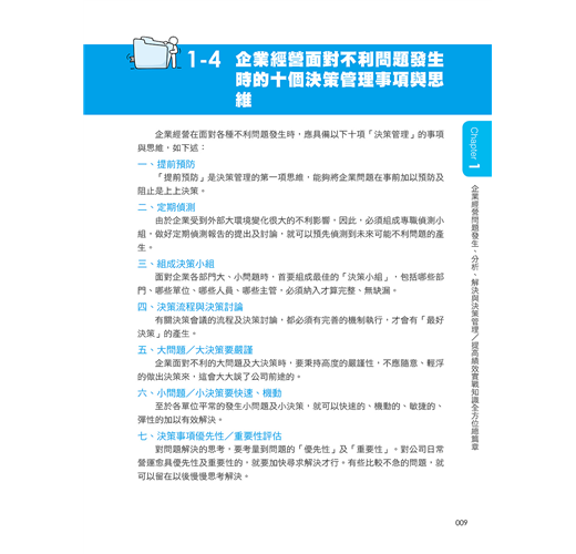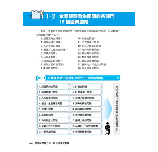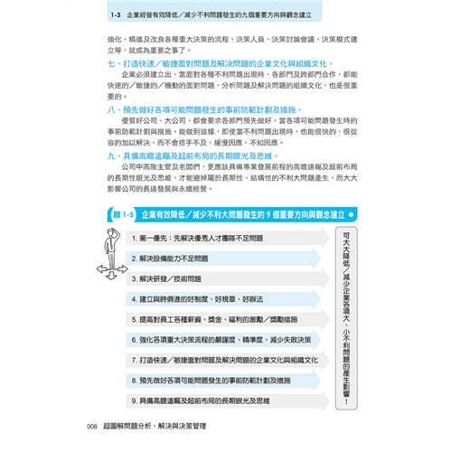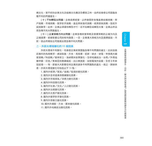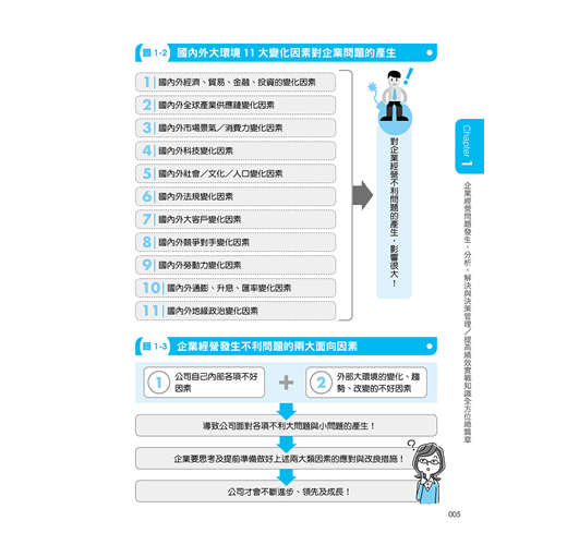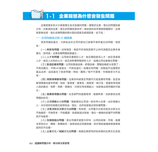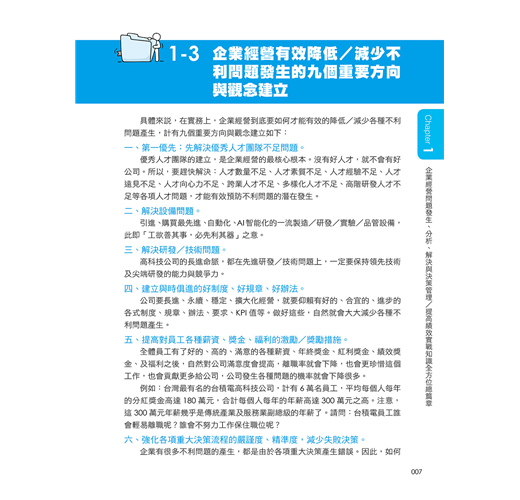 讀者們若是上班族,則會知道除了每個部門日常的營運活動,企業經常面臨新問題發生與新計劃推動,無法每天太舒服的過日子。也常因外部環境與內部環境不斷變化帶來強力衝擊,這些都會影響企業的生存、發展及營運績效。企業如果不能妥善解決問題,或是因應對策不夠有效,那麼企業的獲利及競爭力就會日趨下滑,對上市上櫃公司而言,將會進一步導致公司股價及總市值衰退與不振,這是很嚴重的課題及挑戰。這顯示本書的重要價值所在。