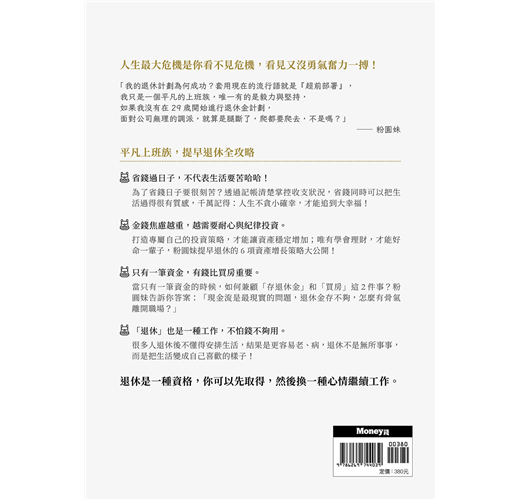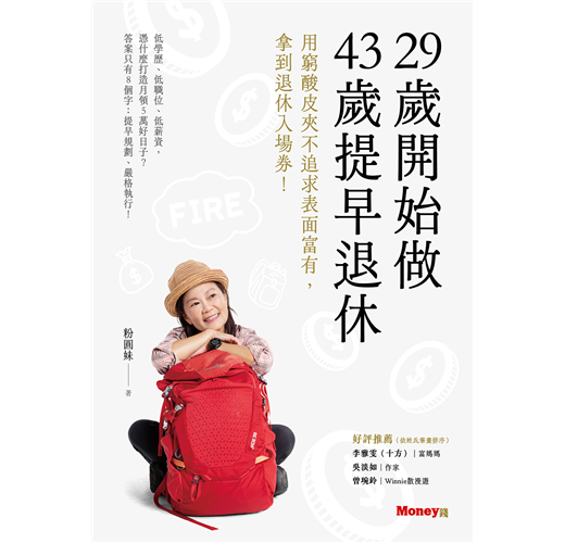 人是目標型的動物,有計劃的人生才會有努力方向,不會在虛耗中度過、茫然中摸索,「活在當下」是要用心去感受,而不是花錢去裝飾面子、填補空虛。人一輩子能賺多少錢是固定的,及早開始儲蓄理財為老後鋪路,有底氣,才有大膽作夢的勇氣,雖然粉圓妹不是抱著幾千萬現金在身邊,也敢拒絕公司不顧員工健康的調派,在43 歲宣布退休,一切都歸功於「長遠布局、紀律執行」,才能在人生轉折中,把危機變成轉機。