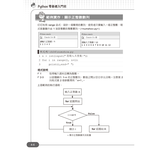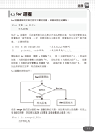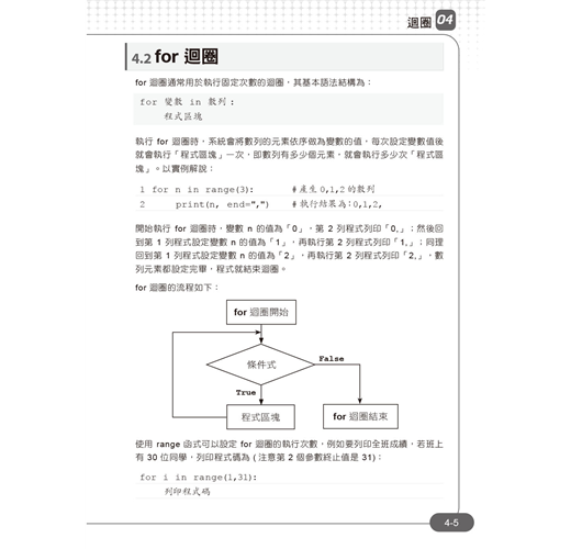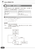 ‧本章範例包括:建立數列\計算正整數總和\井字直角三角形\九九乘法表\找最小公倍數\階乘計算...等。