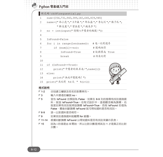 ‧本章範例包括:串列初值設定\迴圈讀取串列\成績計算\刪除串列元素\成績排序...等。