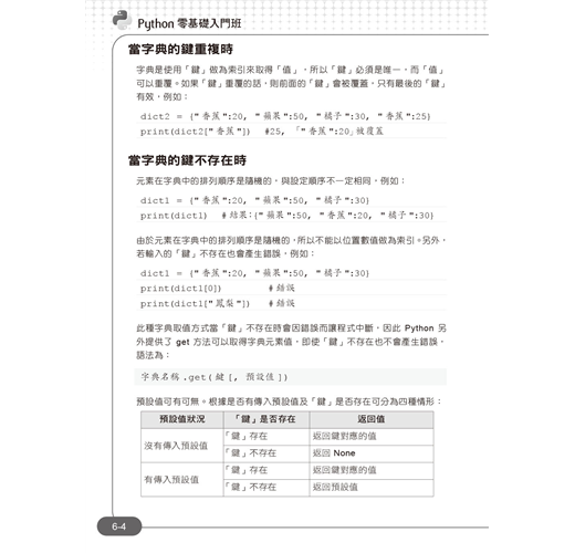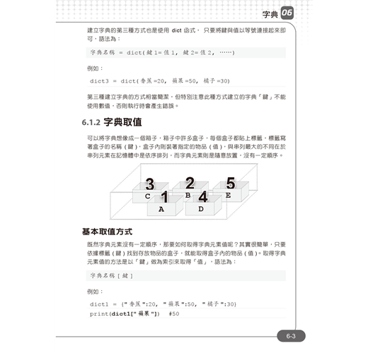 字典資料型態,其元素是以「鍵-值」對方式儲存,運作方式為利用「鍵」來取得「值」。
