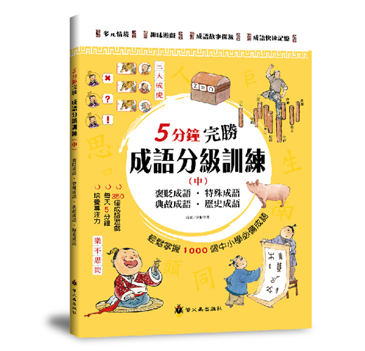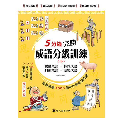 《5分鐘完勝成語分級訓練》共分上、中、下三冊,蒐羅一千個常用成語。成語依使用頻率及難易程度分門別類,並設有350個豐富多變的成語遊戲,結合細緻精美的插圖,力求激發孩子主動親近的興趣,讓孩子在遊戲之中,自然而然達到學習效果,並以此為起點,開展日後語文學習的坦途。