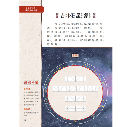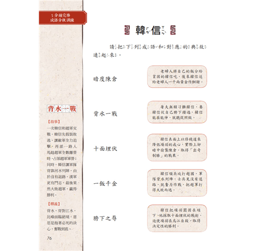 ◎ 知識點涵蓋:基礎認知、近義成語、反義成語、褒貶成語、歷史典故、特殊成語、程度不同的成語和易錯成語,一網打盡成語難點、重點。