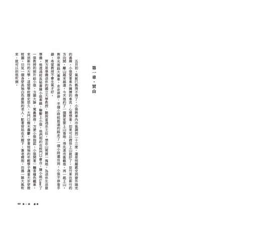 小張望著上坡處一個鐵皮搭建的工寮,地主伍拜的家。「如果您對這塊地有興趣,我就盡快找這塊地的主人談一談。」朱教授從石頭上奮力起身,緊握住小張的手,說:「請你務必,務必幫我談成這塊地,錢,不是問題。就是,你知道,買賣山地,究竟不合台灣的法律。簽約前,我不想出面。就怕一世英名,一不小心毀於一旦,是吧?」小張點點頭,再看一眼山坡上老舊的工寮,屋頂貼皮處處,比狗窩好不了多少。賣掉這塊地,對伍拜也是好的吧。