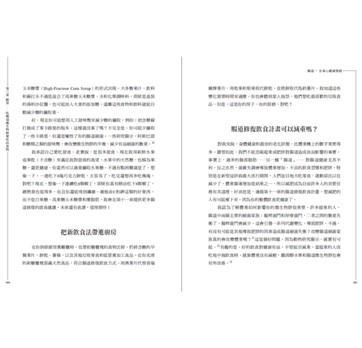 在本書中,她將身體比喻成「一棟房子」、一個我們住一輩子不變的家。然後從各個層面制訂屋子的修復計畫,例如,第一章就介紹最重要的承包商是我們的微生物群,不只存在腸道,皮膚甚至各個器官也有,當中探討了微生物的多樣性、腸道菌叢失調和腸道屏障等等的重要知識,內容相當豐富。其他的章節則寫到「房子的建築師:大腦跟腸」、「廚房」則是告訴我們如何吃才能養出更健康的微生物群、「浴室:消除管道問題」則是在講腸道的通暢,特別是便祕或是稀便等問題跟解法。還有很多很有趣的章節,特別的是還有介紹到房子要有個禪宗的角落去休養身心,從壓力調控、情緒管理及食物等層面來探討,更提供了如何養心的實際法則,最後補充了腸道修復運動週的計畫表以及滿滿的腸道修復食譜,可說是一本含金量相當高的修復指南。