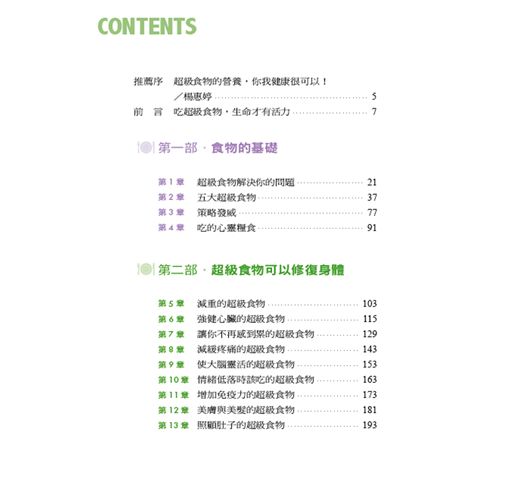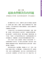 超級食物的概念,不僅與我們選擇原態且均衡飲食的想法十分類似,作者提供了不同身心狀況的營養需求與飲食建議,同時也強調知行合一,讓我們能勇敢步入行動期。此外,作者也提供多種方式告訴我們如何找尋、接近、並且愛上這些超級食材,作者更從食材到香料調味品,直接列一張詳細清單,讓讀者備料時更方便!