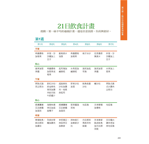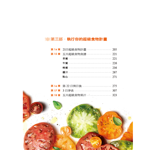 並提供你每天熱量控制在1,600卡內的21日超級食物計畫,與五大超級食物食譜。