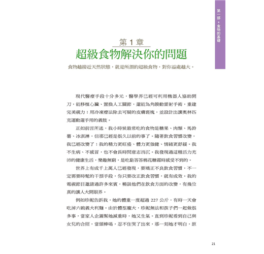 在你為健康所做的各種選擇中,影響最大的莫過於飲食。食物能害你、也能救你;有預防疾病的力量,甚至讓一些疾病不藥而癒。我寫本書的目的,就是讓你擁有駕馭這股力量的能力,無私與你分享我學習到的關於食物、進食與生活的課題: