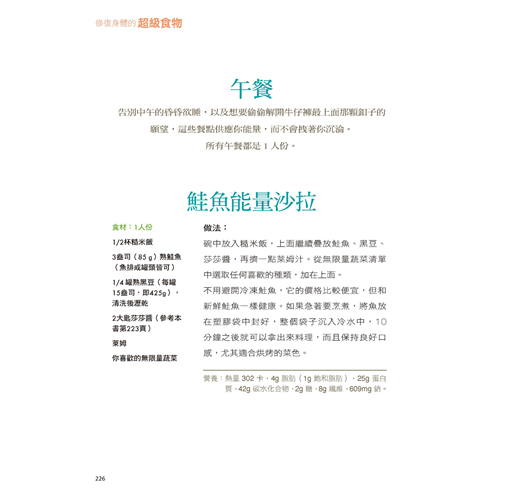 此外,我還發明一種關於飲食的思考方式來進食,不必計算卡路里或套用複雜的規則。計算卡路里和套用複雜規則令人神經緊張,我希望飲食能讓你快樂,不只是因為你喜愛營養食物的美味,也因為你曉得那些食物會讓身體感到多麼美好。