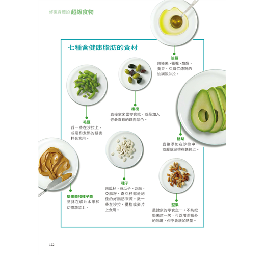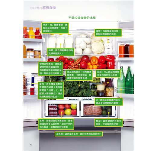 再者,作者提供冰箱、櫥櫃可以放置的食物圖片範本,具體的營造一個健康飲食的環境,最後直接呼應他在一開始的飲食建議──FIXES(好脂肪、好蛋白、多蔬果、好碳水、特殊場合才吃糖),進行21天超級食物計畫,這樣的精心設計與安排,讓我們這些營養工作者汗顏,我邊讀邊潛心學習,對這本書十分著迷,書中的圖文精美,把每一種超級食物的美味跟功能都清楚呈現,彷彿過了這21天,我們都可以組一個英雄聯盟,共同為自己及家人的健康未來努力打拚,抵抗壞糖壞油惡勢力!