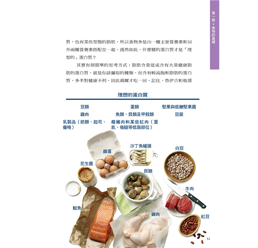 我說過,主要營養素不是單獨作用的。你不會去菜市場買一包蛋白質,而是選購一塊某個部位的肉類,不但擁有大量蛋白質,也有某些型態的脂肪,所以食物多是由一種主要營養素和另外兩種營養素搭配在一起。既然如此,什麼樣的蛋白質才是「理想的」蛋白質?