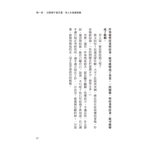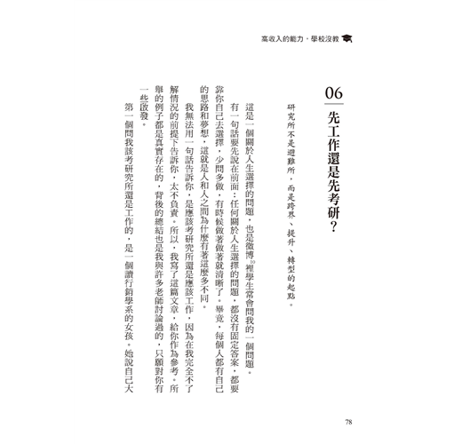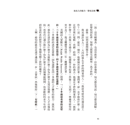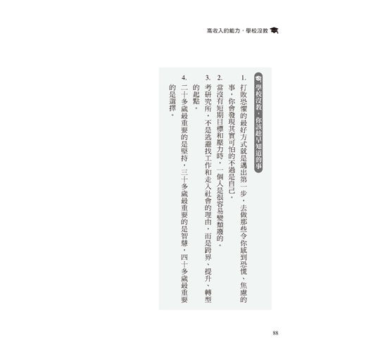 擁有自學能力比亮眼的學歷還更有價值,只要透過持續學習以及不斷進步,便能在職場上創造出對應的成果與經歷,作者在書中提到的各種思維,便是鼓勵我們擺脫傳統思維的束縛,重新將人生掌握在自己手上。