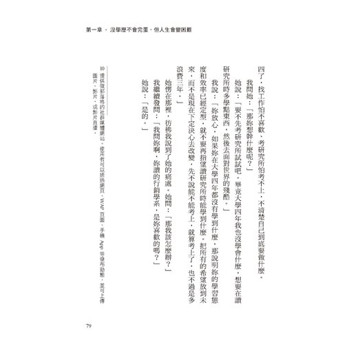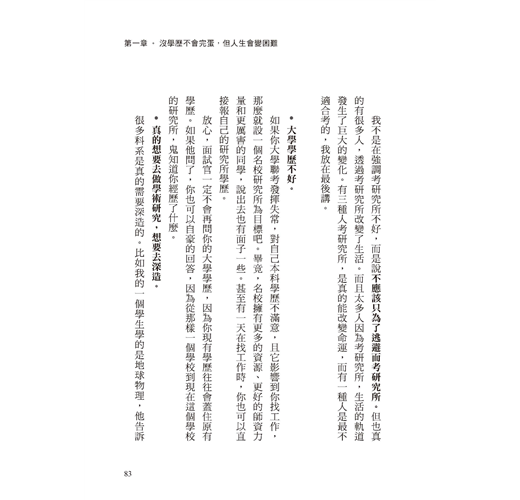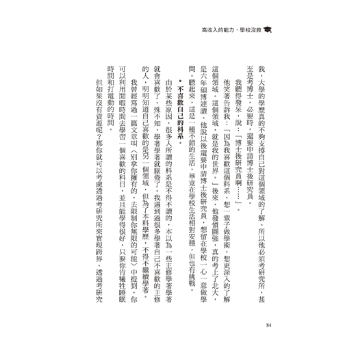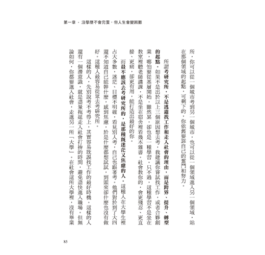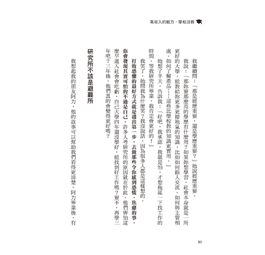 作者對於大學中最值得做的事、職涯闖蕩不可少的心態,和成長思維觀點非常獨特。我非常贊同,也覺得書中分享的故事非常生動、貼切,甚至認為不只是大學生必看,也很推薦給剛出社會的新鮮人閱讀。