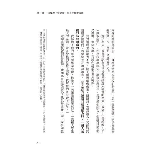 三年疫情期間,我再也沒有機會去寶島臺灣,但我經常自己點一份滷肉飯和蚵仔煎在家吃。當得知這本書能在臺灣大是文化出版,我很開心,因為我知道,海峽兩岸的年輕人遇到的麻煩和困難依舊相似,因為兩岸的關係就是「打斷骨頭連著筋」,也正因為如此,這本書應該對海的對岸的年輕人也有啟發意義。