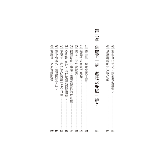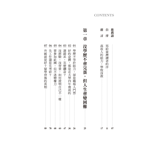 本書分享了大學生到成熟職場人最想、也最需要經歷的知識觀點,「學歷是否重要?」、「英文能力重要嗎?」、「職場必備的生存技能是什麼?」這些都是我平常諮詢,或校園演講中場場被問的問題。