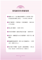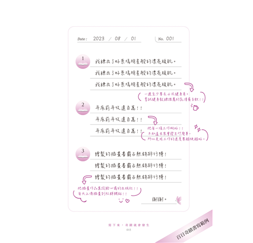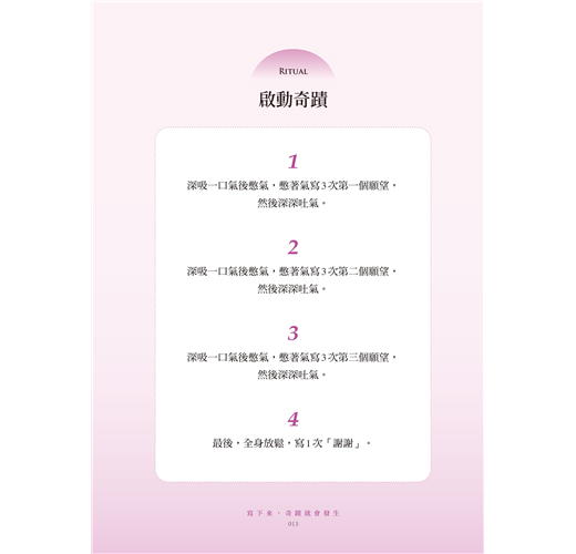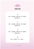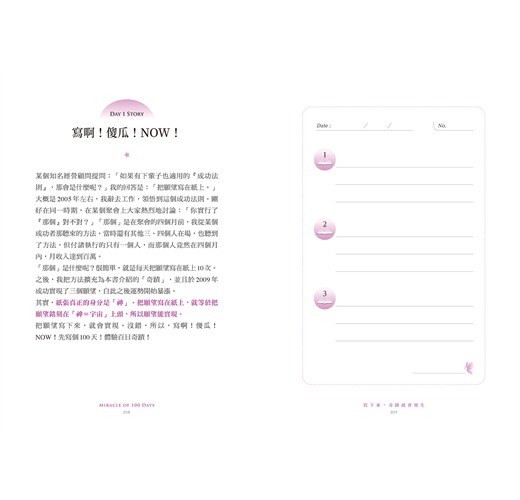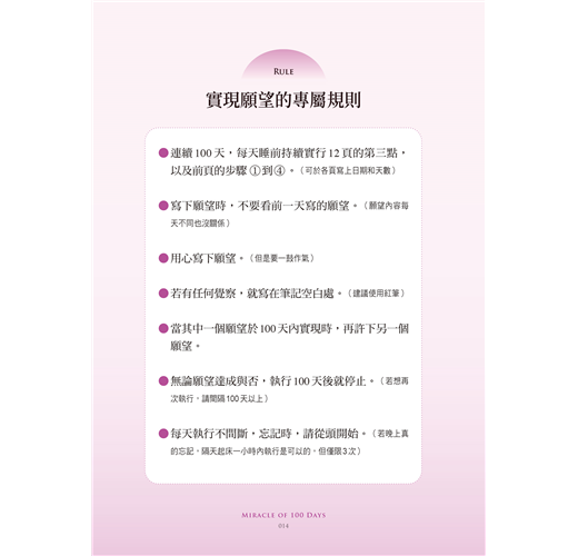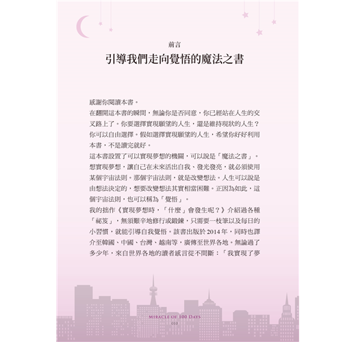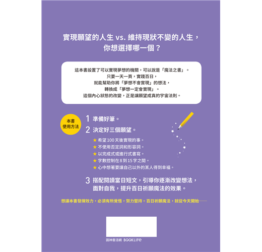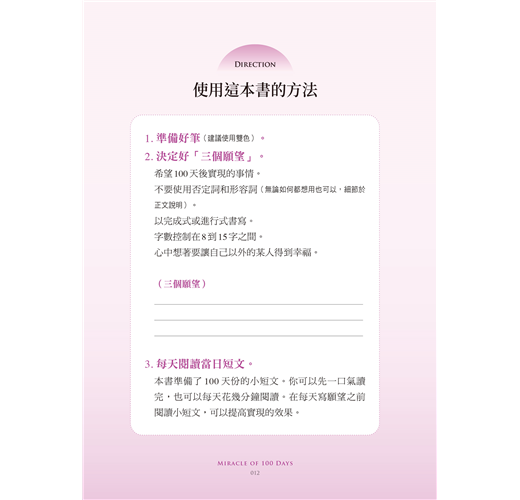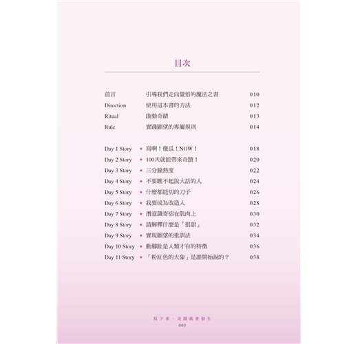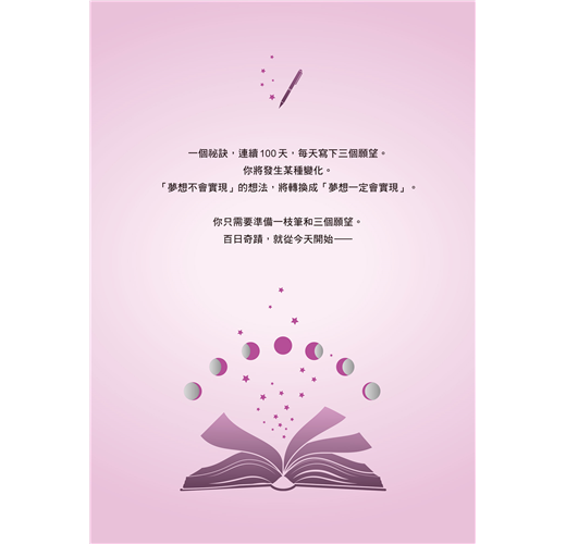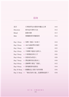 前言 引導我們走向覺悟的魔法之書 Direction 使用這本書的方法 Ritual 啟動奇蹟 Rule 實踐願望的專屬規則 Day 1 Story 寫啊!傻瓜!NOW! Day 2 Story 100天就能帶來奇蹟! Day 3 Story 三分鐘熱度 Day 4 Story 不要瞧不起說大話的人 Day 5 Story 什麼都可以切的刀子 Day 6 Story 我要成為改造人 Day 7 Story 潛意識寄宿在肌肉上 Day 8 Story 請解釋什麼是「很甜」 Day 9 Story 實現願望的重訓法 Day 10 Story 動腳趾是人類才有的特徵 Day 11 Story 「粉紅色的大象」是誰開始說的? Day 12 Story 覆蓋否定...