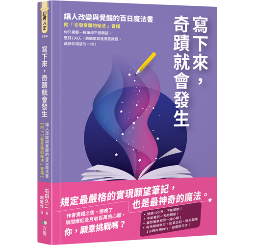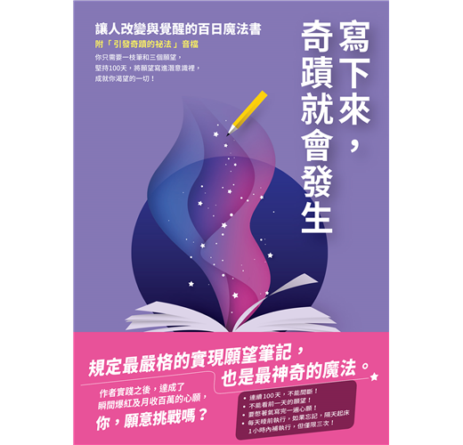 前言 引導我們走向覺悟的魔法之書 Direction 使用這本書的方法 Ritual 啟動奇蹟 Rule 實踐願望的專屬規則 Day 1 Story 寫啊!傻瓜!NOW! Day 2 Story 100天就能帶來奇蹟! Day 3 Story 三分鐘熱度 Day 4 Story 不要瞧不起說大話的人 Day 5 Story 什麼都可以切的刀子 Day 6 Story 我要成為改造人 Day 7 Story 潛意識寄宿在肌肉上 Day 8 Story 請解釋什麼是「很甜」 Day 9 Story 實現願望的重訓法 Day 10 Story 動腳趾是人類才有的特徵 Day 11 Story 「粉紅色的大象」是誰開始說的? Day 12 Story 覆蓋否定句的詞彙 Day 13 Story 「媽媽,買臭魚乾嘛」 Day 14 Story 不必成為大人物,成為自己就好 Day 15 Story 48小時內會發生好事! Day 16 Story 小精靈早就在身邊了 Day 17 Story 越挫越勇的大師──僧侶空海 Day 18 Story 脫離險境的方法很簡單,「走」就對了 Day 19 Story 這個聲音,是「高我」傳達的訊息? Day 20 Story 不要過度仰賴直覺 Day 21 Story 與其期待死後世界,不如活在當下 Day 22 Story 只會做蛋包飯就好 Day 23 Story 把咖哩調理包賣給印度人的方法 Day 24 Story 無敵的萬用調味料 Day 25 Story 雞蛋疑雲 Day 26 Story 如上等卡士達醬般的音質 Day 27 Story 你有即使限制很多也想嘗試的事情嗎? Day 28 Story 下坡比上坡更危險 Day 29 Story 寫下夢想,決定人生要長怎樣 Day 30 Story 開運日必做的事 Day 31 Story 海螺可怕的地方 Day 32 Story 獨角仙的哀愁 Day 33 Story 好想吃點什麼好吃的 Day 34 Story 連續17年的好習慣,竟然就這樣忘了 Day 35 Story 有必要跟別人說自己的願望嗎? Day 36 Story 成為有錢人最簡單的方法 Day 37 Story 用幾十元牙膏好嗎? Day 38 Story 人生的轉捩點,從說「我真好運」開始 Day 39 Story 很遺憾,才華決定了一切 Day 40 Story 「沒關係,我有錢」完全勝利組的女大學生 Day 41 Story 愛的相反是冷漠,感謝的相反呢? Day 42 Story 應該投注心力的地方 Day 43 Story 人生的三大支柱 Day 44 Story 雖說許願要用完成式…… Day 45 Story 竹林的祕密 Day 46 Story 獲得財富的咒語 Day 47 Story 人蟲大戰之謎 Day 48 Story 圓的悖論 Day 49 Story 大腦總是試圖填補空白 Day 50 Story 未來就在右上方 Day 51 Story 哈希法則 Day 52 Story 強運的人 Day 53 Story 人一生會死三次 Day 54 Story 火星沒辦法住人的真正原因 Day 55 Story 社會是由資訊形成的 Day 56 Story 自以為可愛的女生 Day 57 Story 透過自我驅邪,讓運勢谷底回升 Day 58 Story 在懷紙上寫下「日」字的祕術 Day 59 Story 大日如來佛就是華麗耀眼 Day 60 Story 喜歡沒什麼不可以 Day 61 Story 宇宙最強的咒語:「以神之身」 Day 62 Story 對身體不好就不吃了嗎? Day 63 Story 那樣想是不是有點偏激? Day 64 Story 讓自己不幸的習慣 Day 65 Story 實現願望的不是右腦,是左腦! Day 66 Story 不斷提問,然後放著就好 Day 67 Story 確信是如何形成的? Day 68 Story 學校風雲人物的畢冊照片 Day 69 Story 人生不會因為一句話而改變,卻會因為兩句話產生變化 Day 70 Story 覺悟的三階段應用 Day 71 Story 鬼真正可怕的原因 Day 72 Story 我可愛的未來小寶貝 Day 73 Story 屁股變成三七分的話怎麼辦? Day 74 Story 當我感到有點沮喪時 Day 75 Story 沒有遺憾的人生好嗎? Day 76 Story 讓眼角產生皺紋 Day 77 Story 咖哩加醬汁,草莓淋煉乳 Day 78 Story 你也去跳傘吧 Day 79 Story 定能飛向天空 Day 80 Story 去做「做得到的事」很簡單 Day 81 Story 你實在沒辦法去便利商店嗎? Day 82 Story 改變人生要先有100萬 Day 83 Story 賣石頭的男子 Day 84 Story 「我的時代」勝過風的時代 Day 85 Story 對因傑拉的憧憬 Day 86 Story 添麻煩也沒關係 Day 87 Story 卡其色的求職西裝 Day 88 Story 現在是「女人60才開始」 Day 89 Story 站在小麥的立場思考後發現的可怕事實 Day 90 Story 用Baccarat水晶杯喝氣泡水 Day 91 Story 布料會吸收波動 Day 92 Story 從358到369 Day 93 Story 彌勒菩薩是超人力霸王 Day 94 Story 妖精也能派遣!? Day 95 Story 花真是太棒了! Day 96 Story 世上真的有奇妙的事 Day 97 Story 不斷拯救我的一段話 Day 98 Story 可以任意移動的將帥 Day 99 Story 學會九九乘法 Day 100 Story 來自外星智慧生命體的訊息 後記 通關密語就是──隨便怎樣都好! 引發奇蹟的祕法音檔
