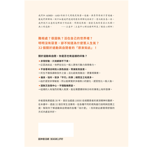 作者是執業超過30年、曾診治超過10000名相關患者的資深精神科醫師,在本書中,透過32個日常生活事例,從各種不同的視角進行說明與因應之道,幫助你了解過動與自閉者的各種「為什麼」,找到彼此都覺得舒服的方式共處並共好。