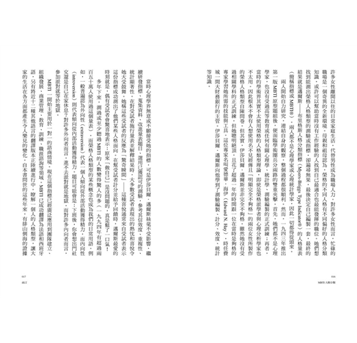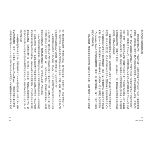 作者是MBTI人格分類系統的創發人,本書也是MBTI的真正原典,內容清晰簡易,採用圖表充分解說,輕易就可理解,無須參看其他二手詮釋。