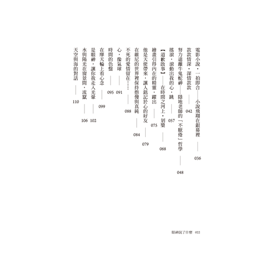 《眼神說了什麼》共收錄五十八篇文章,其中有十一篇曾收錄在二○二○年五月出版的《《歸鄉》的親子關係與俄羅斯文化:這位導演,讓我想起我爸媽》、一篇收錄在《當音樂響起,你想起誰》,對已看過上述那兩本書的讀者致歉,也藉機解釋會堅持如此收錄,是為了我很珍惜《人間福報》副刊散文專欄,每至交稿期,視當時生活或新聞所產生的情狀而書寫,有我個人的心緒。主體在於《人間福報》「心之所念」專欄(一篇)再至「樵言悄語」三年(三十六篇),當時還沒有疫情,希望能使這些篇章完整收錄於書上。