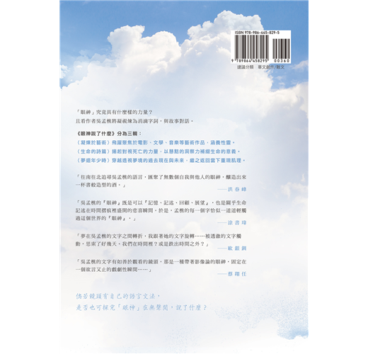 「吳孟樵的『眼神』既是可以『記憶、記述、回顧、展望』,也是關乎生命記述在時間摺痕裡盛開的悲喜瞬間。於是,孟樵的每一個字恰似一道道輕觸過這個世界的『眼神』。」──涂書瑋