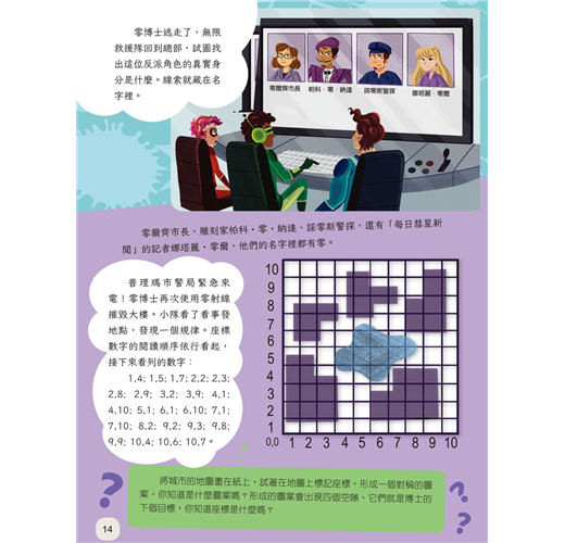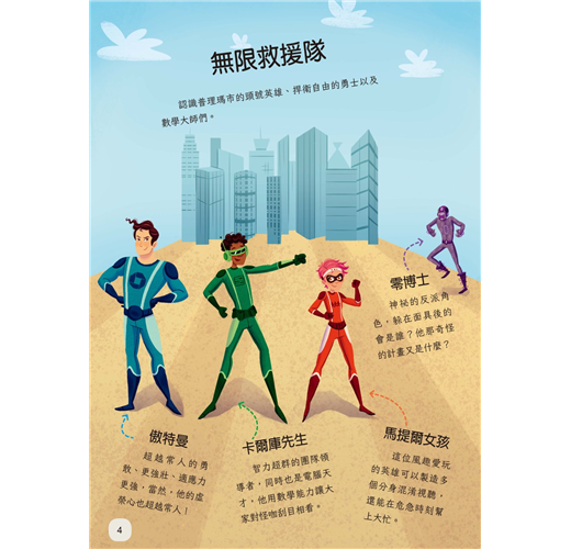 加入他們的行列,解開神祕的線索、數學地圖和破解數字代碼來幫助他們完成任務,成為數學超級英雄吧!
