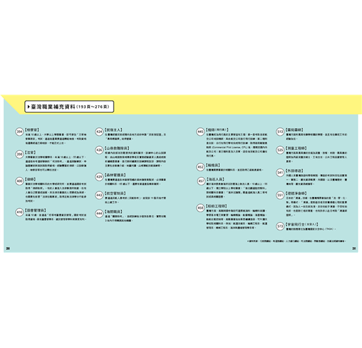 ★推薦序 ★動畫製作公司 動畫副導演/動畫導演/動畫師(原畫、動畫)/動畫編劇/作畫導演/動畫製作人/執行製作/動畫攝影/色彩設計/電腦繪圖設計師/原型師/聲優(配音員) ★足球場 俱樂部人員/裁判/運動經紀人/足球選手/球場管理員/運動訓練師/啦啦隊/實況主播/運動攝影師/領隊/諮商心理師/教練/體育記者/口譯員/球探 ★社區大樓 漫畫家/保母/室內裝潢設計師/聯盟行銷主/網紅(YouTuber)/投資專家/插畫家/翻譯員/手作工藝師/線上家教/社區公寓總幹事/大樓維修保養人員 ★購物商場 占卜師/美妝部店員/數位影像照相館店員/服飾店店員/購物商場營運人員/賣場銷售員/書店店員/鞋類銷售員/驗光師/街頭藝人/便當店店員/電影版權買家 ★電影院 編劇/服裝造型師/旁白配音員/攝影指導(電影攝影師)/演員/食物造型師/副導演/錄音工程師/妝髮造型師/特技替身演員/音樂製作人/電影導演 ★遊戲製作公司 角色設計師/聲音設計師/職業玩家/遊戲總監/遊戲測試員/遊戲製作人/遊戲設計師/遊戲繪師/遊戲工程師 ★商店街 寵物店店員/麵包師傅/髮型設計師/牙科技師/牙醫/偵探/口腔衛生師/食品衛生稽查員/牙科助理/餐廳店長/甜點師傅/理容師/現場採訪記者/寵物美容師/電視助理導播 ★車站 蕎麥麵師傅/計程車司機/旅行社職員/補習班老師/花店店員/鐵路車輛駕駛員/臨床心理師/列車長/公車司機/不動產銷售人員/速食店店長/手機店店員 ★事務所 不動產估價師/記帳士/海商法律師/專利師/稅務律師/地政士/社會保險勞務士/公認會計師 ★銀行 理財專員/銀行辦事員/證券公司職員/基金經理人/證券投資分析師/人壽保險公司職員/精算師/產物保險公司職員/信用卡行銷專員/保險鑑定員 ★市政府 市議會議員/市政府職員/市長/環境顧問/財務專員/嗅覺判定員/建設顧問/環境監測人員/造園景觀技術士/重型機具操作員 ★音樂廳1 美術人員/音樂家/音響人員/音樂會統籌/舞台監督/音控師/燈光人員/音樂記者/音樂會人員/藝人與製作部(A&R)/樂器設備管理員/服裝設計師 ★音樂廳2 音樂廳人員/芭蕾舞者/落語家/鋼琴家/能樂師/指揮家/演奏家/樂器製作師/鋼琴調音師/舞台劇演員/歌舞伎演員 ★住家1 自來水處職員/家事服務員/皮革師傅/鎖匠/郵局職員/電腦老師/清潔隊員/演藝工作者/賽車選手/居家照顧服務員/日本將棋棋士/宅配人員 ★住家2 鋼琴老師/動物護理師/搬家作業員/獸醫師/家務幫手/專業部落客/書法家/消防員/警察/英語老師/大眾澡堂老闆/寵物陪伴員/柔道整復師 ★學校 小學老師/保健老師/學校行政人員/高中老師/雕刻家/廚師/營養師/學校工友/特教老師/安親課輔老師/國中老師/心理輔導老師 ★運動公園 田徑選手/職棒選手/排球選手/職業拳擊手/籃球選手/橄欖球選手/職業摔角選手/職業網球選手/游泳選手 ★健身俱樂部 美甲師/經絡按摩師/美容師/芳療師/推拿按摩指壓師/針灸師/整復師/健美先生/健康運動實踐指導員/運動教練/瑜伽老師/健身俱樂部員工 ★安置中心 家事調查官/少年保護官/照護服務提供專員/個案管理師/照護輔具諮商專員/生活諮商人員/長照專案專員/醫療社工人員/照顧服務員/護佐人員/營養師/寵物犬訓練師 ★兒童福利機構 兒童生活指導員/助產師/嬰兒按摩指導員/婦產科醫師/ 衛教師/教保員/育兒諮商師/小兒科醫師/幼兒園老師/兒童社工員 ★醫院1 護理師/醫療放射線師/臨床醫撿師/病歷管理師/醫師/藥師/醫院祕書/醫療器材臨床工程師/醫療事務員/醫療行銷師(MR)/醫療軟體工程師 ★醫院2 器官移植協調師/職能治療師/臨床試驗協調員/視覺復健師/語言治療師/物理治療師/義肢裝具師/病房事務員/救護技術員/醫療機器廠商職員/臨床研究專員 ★捷運上 網際網路公司職員/日用品廠商職員/行動電話公司職員/物流公司職員/地產開發商/鋼鐵公司職員/食品廠商職員/纖維廠商職員/文具廠商職員/化工原料廠商職員/運動用品廠商職員 ★住商建築公司 室內設計師/建築師/燈光設計師/長照業務/室內裝潢協調員/建築模型師/建設公司職員/建築設備廠商職員/電腦輔助設計員 ★廣告公司 電視廣告企劃/平面設計師/作曲家/藝術指導/電視廣告導演/廣告代理商業務/包裝設計師/飲料廠商職員/廣告文案師/展示設計師/活動企劃師 ★辦公大樓1 調酒師/侍酒師/報關員/貿易公司職員/工業設計師/調香師/電子廠商職員/化妝品廠商職員/保母/珠寶設計師/雕金師/廣播電台企劃/珠寶廠商職員/毒品取締官/廣播電台主持人/作詞家 ★網際網路服務公司 銷售工程師/基礎設施工程師/市場行銷人員/數據分析師/產品經理/UI/UX設計師/後端工程師/前端工程師/白帽駭客 ★共享工作空間 網頁設計師/嵌入式系統工程師/網頁設計總監/AI工程師/網路寫手/機器人工程師/點字翻譯師/網路商店老闆/影片創作者/應用程式(App)工程師 ★街區小巷 時尚顧問/雜貨設計師/模特兒/巧克力製作師/咖啡店老闆/採購專員/服裝廠商職員/俱樂部DJ/紡織品設計師/服裝設計師/採購企劃員(MD)/打版師 ★公司內部 行銷專員/稽核人員/投資人關係(IR)/產品企劃/經營企劃/業務助理/法務專員/人事專員/總務專員/祕書/會計/總機接待員 ★辦公大樓2 人力派遣公司業務/國稅專員/人力調度員/隱私權政策顧問/職涯顧問/經營顧問/IT顧問/人事顧問/客服人員/維修工程師 ★電視台 影音串流公司製作人/電視導播/電