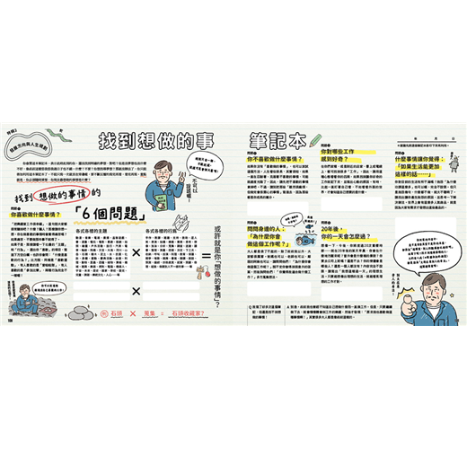 你有哪些興趣?對哪些工作感到好奇?20年後的你想做什麼?不喜歡做的事情是?透過「找到想做的事筆記本」,能讓你更加了解自己喔!