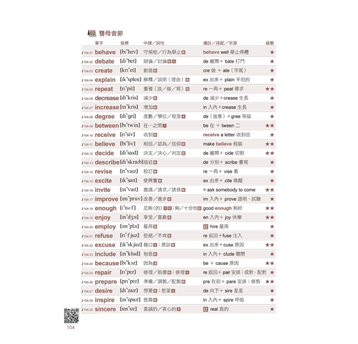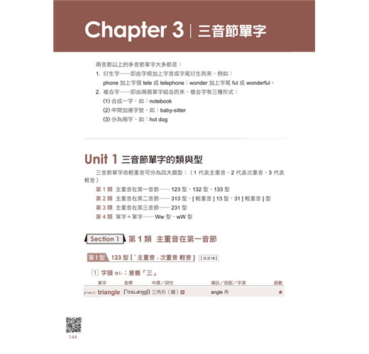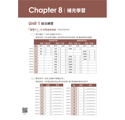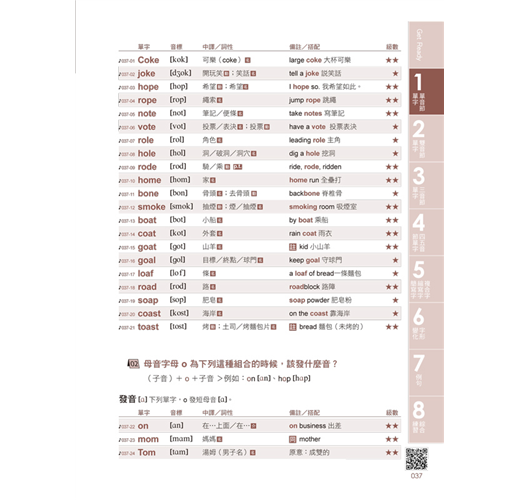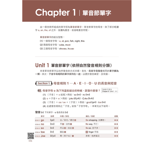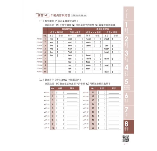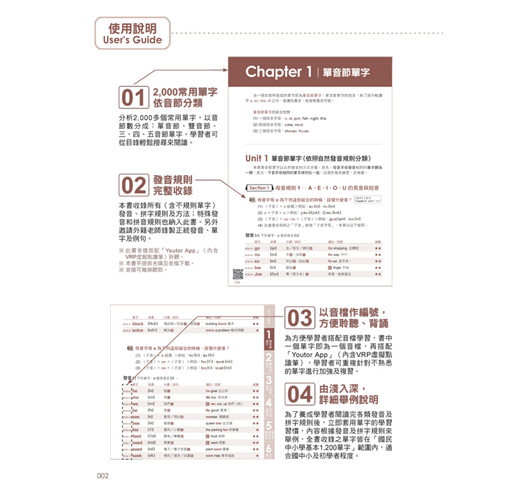 聽音辨字、看字讀音,不用再死背。單字編排由淺入深,從發音中最基礎的單音節單字開始,到雙音節、三、四、五音節單字。了解這些發音規則,以後只要看到單字、聽到單字就會唸,會唸就會拼,能拼出來就一生難忘。