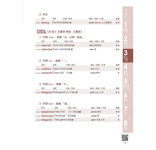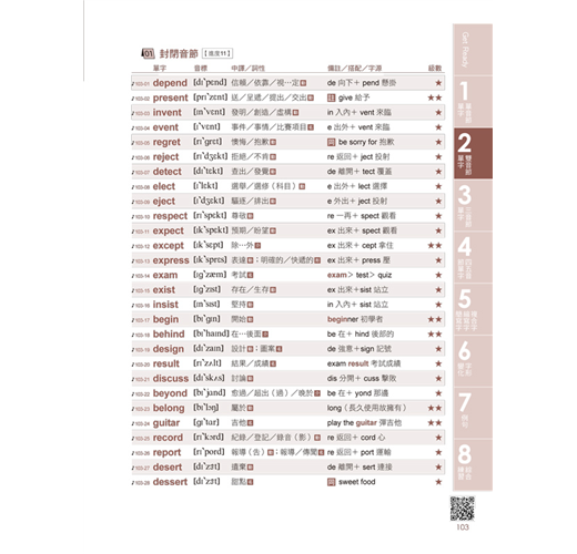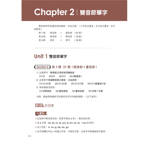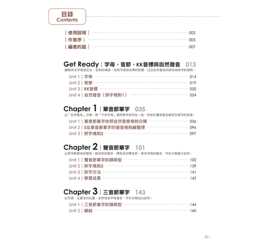 分析2,000多個常用單字,以音節數分成:單音節、雙音節、三、四、五音節單字。學習者可從目錄輕鬆搜尋來閱讀。