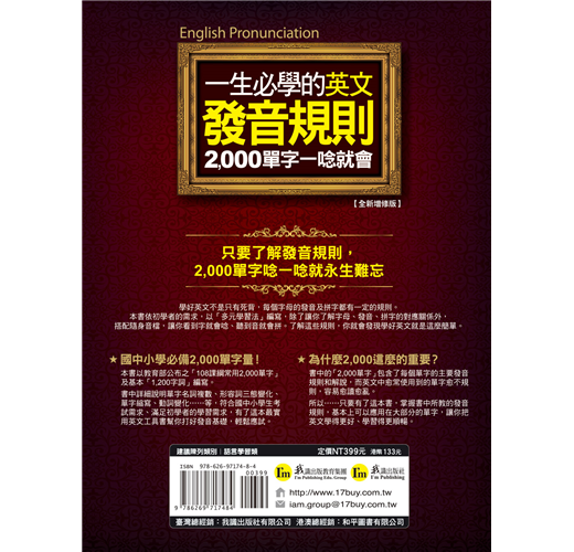 《一生必學的英文發音規則---2,000單字一唸就會【全新增修版】》全書就是以這種神奇的發音規則為基礎編寫,保證可以解決台灣學生背單字的痛苦!本書以教育部公佈之英語「常用2,000單字」及「國民中小學最基本之1,200單字」編寫而成。發音規則單字速記法就是:看字讀音、聽音拼字!只要看到字、聽到字就會唸,會唸就會拼,拼出來就終生難忘!請記住!不要死背單字!