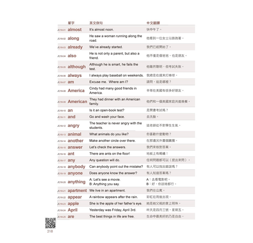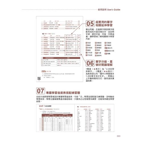 本書依據教育部公布「2,000常用單字」及「國中小基本1,200單字」編寫,並補強發音規則範例、複合字中單字、片語單字、簡易人名、be動詞與代名詞變化形態、不規則動詞過去式等。並增加能增廣見聞單字,提升學習成就。