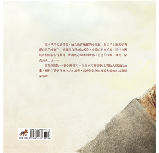 這是個關於一隻小麻雀和一位無家可歸遊民之間動人情誼的故事,相信不管是什麼年紀的讀者,都會被這個充滿愛和憐恤的故事深深感動。