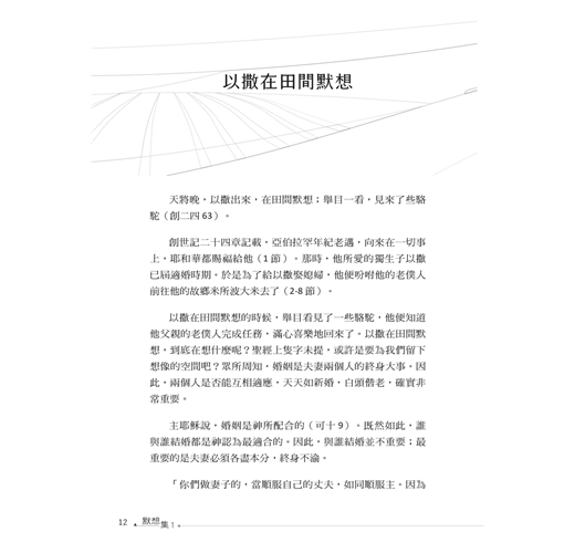 謝順道長老的《默想集》是一部給讀者提供默想空間的書籍,名字的靈感來自《創世記》中以撒在田間默想的情境。