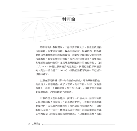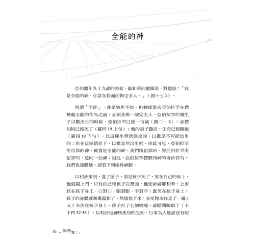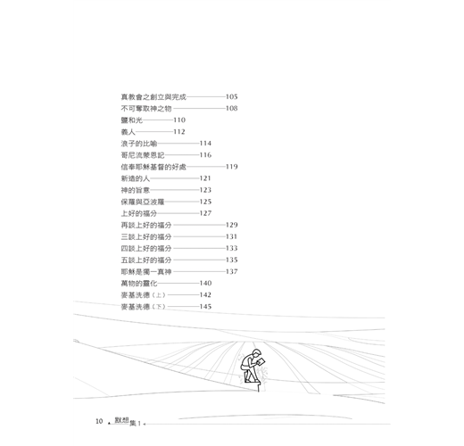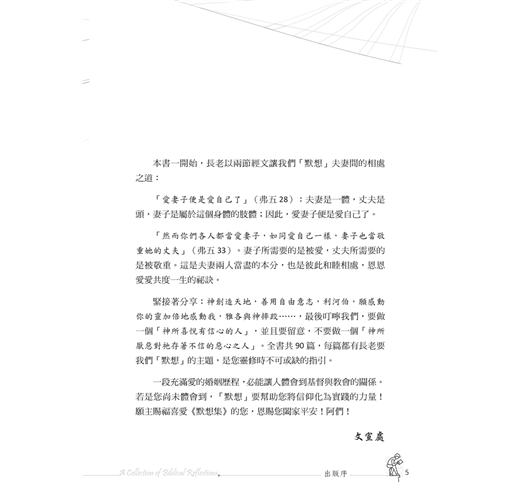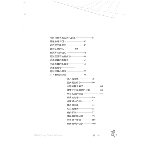 本書《默想集》這個書名,就是為了給與諸位讀者保留一個默想的空間而命名的;而且將〈以撒在田間默想〉排在第一篇,藉以開宗明義地聲明作者著作本書的宗旨了。本書總共九十篇,每篇大約一千多個字。諸位讀者若走馬看花似地看,則只需花五分鐘就看完...