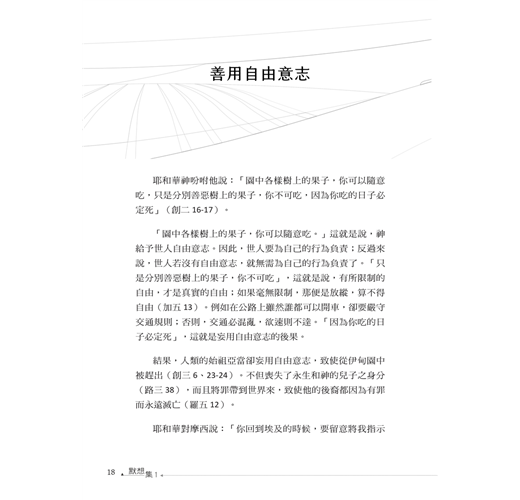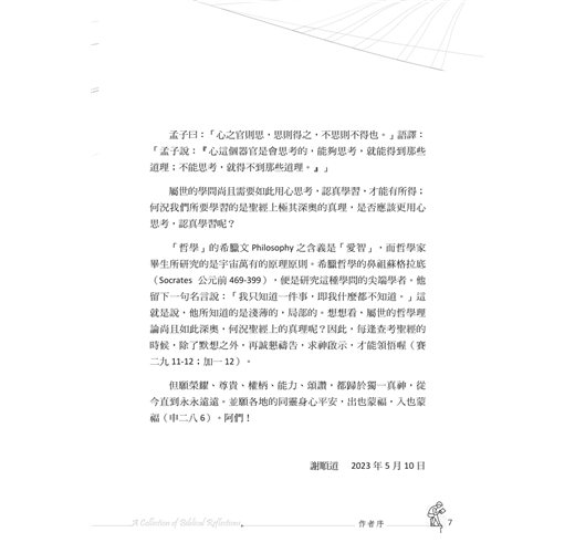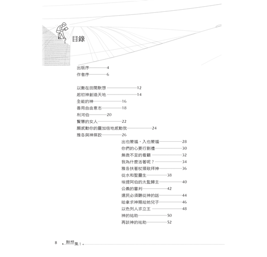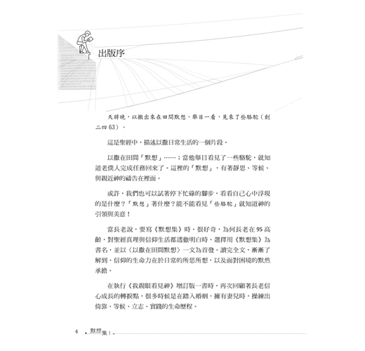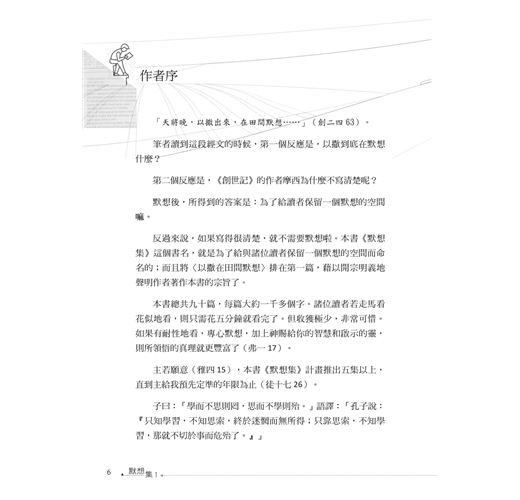 主若願意(雅四15),本書《默想集》計畫推出五集以上,直到主給我預先定準的年限為止(徒十七26)。子曰:「學而不思則罔,思而不學則殆。」語譯:「孔子說:『只知學習,不知思索,終於迷惘而無所得;只靠思索,不知學習,那就不切於事而危殆了。』」孟子曰:「心之官則思,思則得之,不思則不得也。」語譯:「孟子說:『心這個器官是會思考的,能夠思考,就能得到那些道理;不能思考,就得不到那些道理。』」