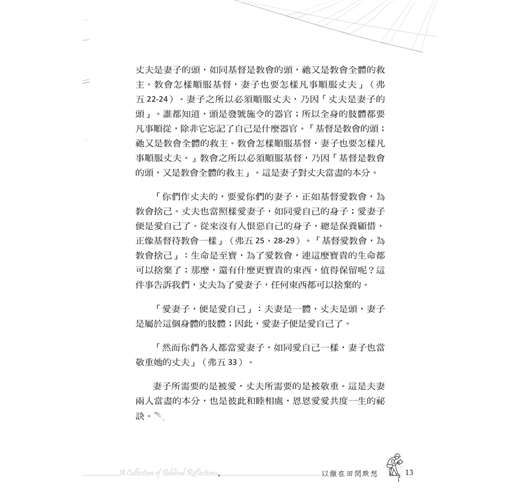 這本書總共有九十篇文章,每篇約一千字左右。雖然簡短,在這講求效率與即時的時代,如果僅快速瀏覽,有可能錯過深層的真理。相反的,如果慢慢體會,結合神賜予的智慧和啟示,將有可能獲得更豐富的領悟。