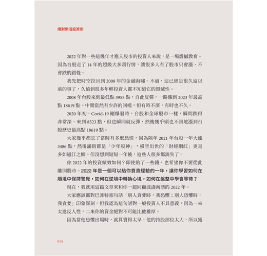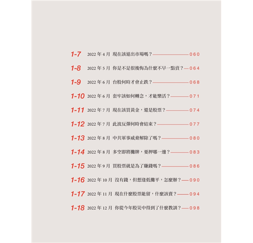 市面上唯一一本教你如何在空頭市場避險、轉念的投資寶典。不只帶你看「怎麼賺,更帶你看怎麼面對跌」突破投資心魔及操作方法。