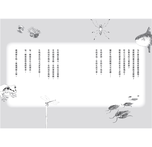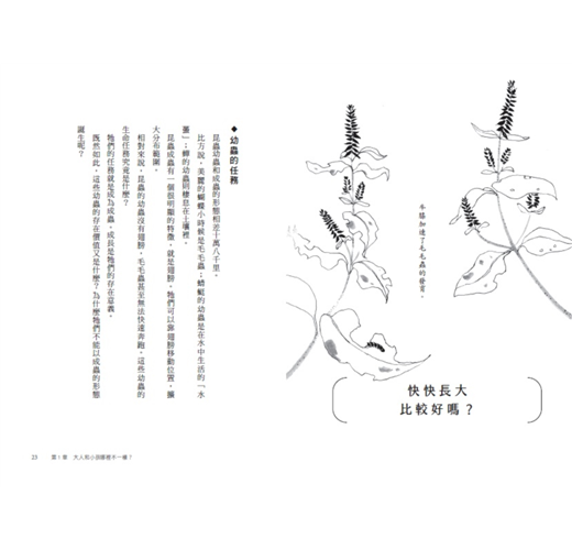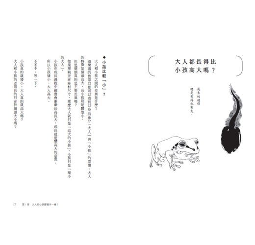 如果今天這本書直接告訴你,甲生物是因為某某理由而讓幼體時期很長,這種寫法一定會給你教科書那種無聊感。但是如果換個方法,帶你回到知識產生的現場,讓你看到甲生物、乙生物、丙生物怎麼過日子,你的大腦就會自動開始比較他們,然後就會發現差異,接著給出一個合理化這種現象的說法。而本書走的就是這個路線,會帶大家去看不同生物的成長,讓讀者自己去比較、去思考生物在成長時到底做了什麼事,又為什麼要用這種方式做。