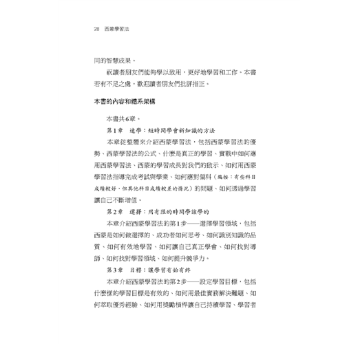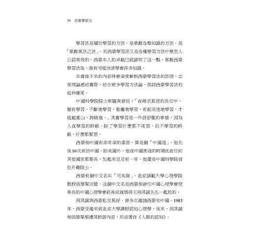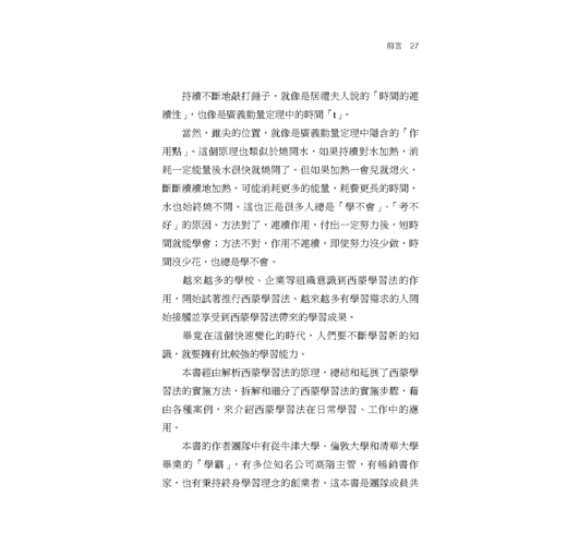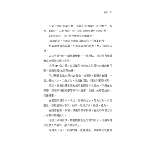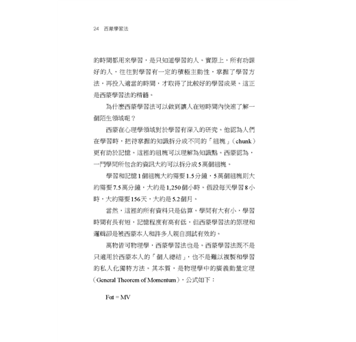從西蒙的角度來看,學習=積極的學習動機×有效的學習方法×必要的時間投入。此書開頭以上述公式為基底,逐一解析每一項要件,並且提供作者自身過去經驗當作實例佐證;書中也適時穿插一些其他人的成功案例,拓展了應用層面,讓此書的實用價值更加齊備、完整。