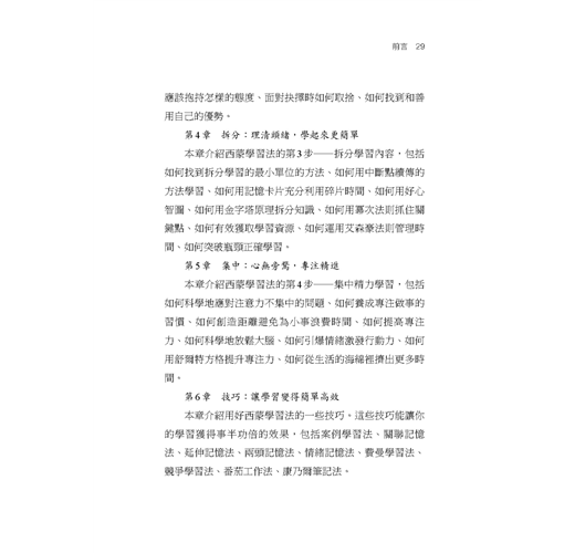 (3)拆分學習內容:這本書有六大章節,每週閱讀兩個章節,最後一週進行重點整理撰寫心得