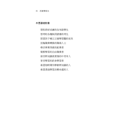 此書以西蒙學習法為主軸,延伸出好幾條支線,涵蓋了有關學習、記憶、準備考試的各種面向,是一本通用型的學習書籍,無論是在校學生、職場工作者、終身學習的退休族,都可以從此書學到很實用的知識與技巧。