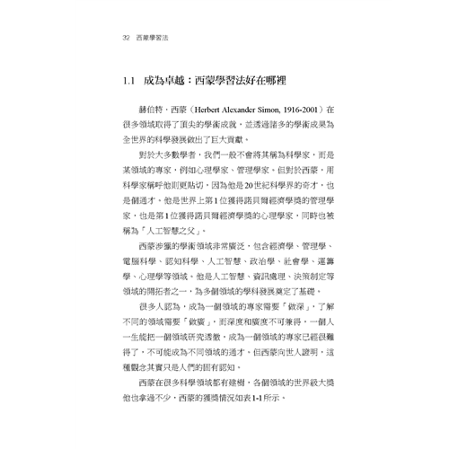 另外附帶一提的是,赫伯特‧西蒙本身是一位跨領域的通才,在經濟學、管理學、電腦科學、認知科學、人工智慧、政治學、社會學、運籌學、心理學等領域都有涉獵,並在不同領域榮獲了多項國際大獎的肯定。乍看之下,他是個天才,我們普通人怎麼可能仿效他、達到一位天才所擁有的成就呢?