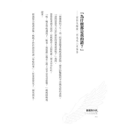 「反正一切都是我的錯。就算我受傷了,也是我的錯。」螢螢邊啜泣,邊說道:「今天上數學課的時候,我突然越想越難過……為什麼都是我的錯?結果就哭出來了。」