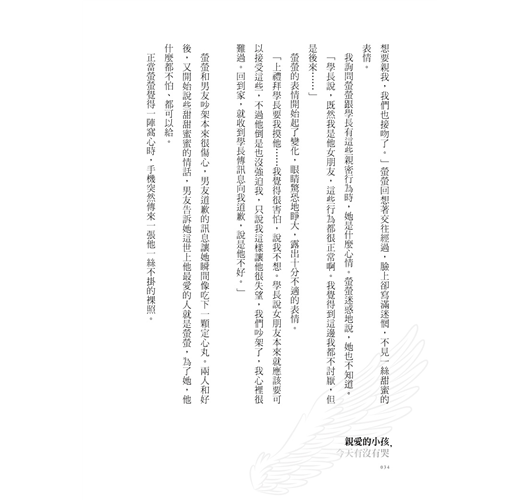 「學長說,既然我是他女朋友,這些行為都很正常啊。我覺得到這邊我都不討厭,但是後來……」螢螢的表情開始起了變化,眼睛驚恐地睜大,露出十分不適的表情。「上禮拜學長要我摸他……我覺得很害怕,說我不想。學長說女朋友本來就應該要可以接受這些,不過他倒是也沒強迫我,只說我這樣讓他很失望,我們吵架了,我心裡很難過。回到家,就收到學長傳訊息向我道歉,說是他不好。」