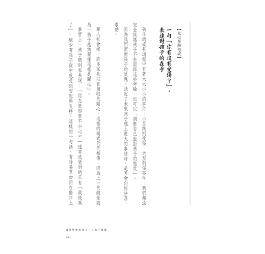 ●蔡淇華老師:「我見過太多孩子,被父母親如刀劍的眼神傷害過,終生,無法痊癒。如同謝依婷醫師在《親愛的小孩,今天有沒有哭──兒少精神科醫師與他陪伴的風雨家庭》一書中所言:被認為有狀況的小孩,其實是家庭問題的照妖鏡。這本書呈現青少年的病徵,也爬梳問題背後的問題。期待關心下一代的每個人,都能翻閱這本書。讓我們一起從孩子淚水的來處,陪他們走向溫暖、有光的所在。」──摘於推薦序(蔡淇華◎台中惠文高中教師兼圖書館主任/作家)