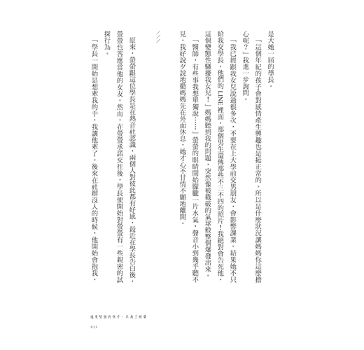 「她是什麼感覺……?」螢螢媽媽突然語塞,只是遲疑地重複著我的話。「我怎麼知道她有什麼感覺?她從來都不說啊。我這個女兒從小就很傻、很好騙,別人跟她說什麼都『好好好』,從來不反駁,所以我才會這麼擔心她。現在果然發生事情,我明明跟她說過……」