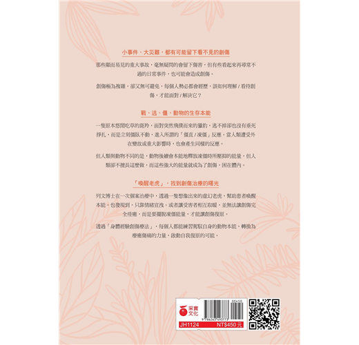 列文博士更提出了「身體經驗創傷療法」,每個人都能練習駕馭自身的動物本能,轉換為療癒傷痛的力量,啟動自我復原的可能。