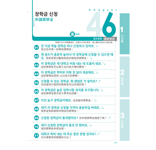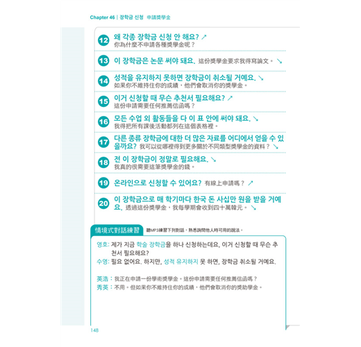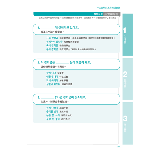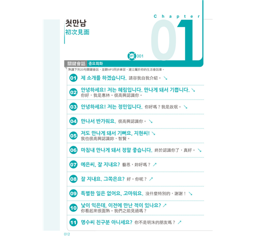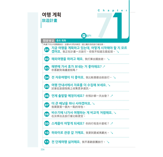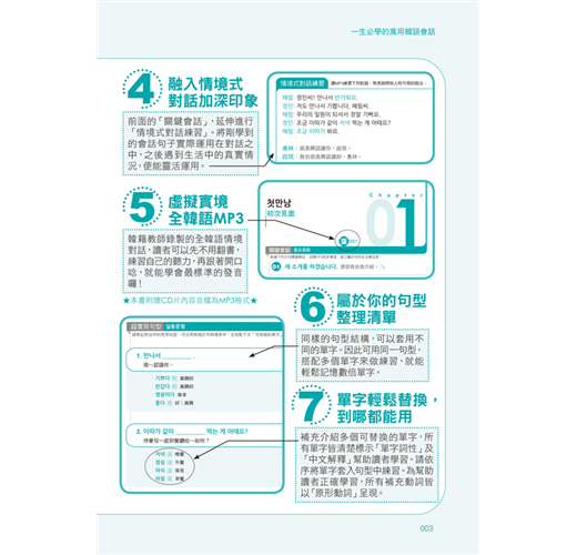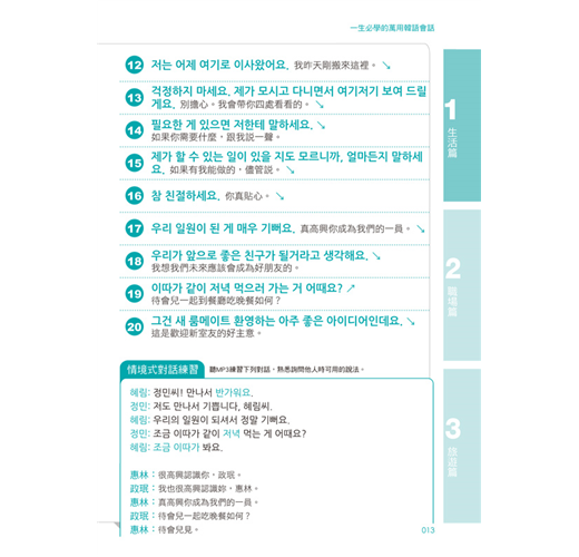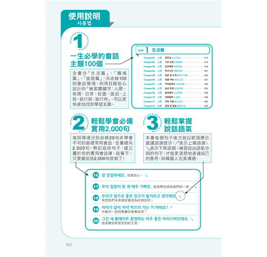 依「生活篇」、「職場篇」、「旅遊篇」三大情境分類,並應用「關鍵會話句」組成100篇對話練習,熟悉與韓國人對話的過程!